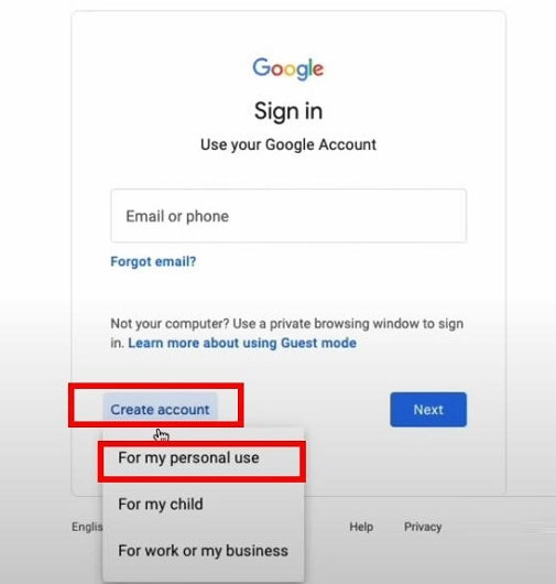 2、再点击“Create account”选择“Formy personal use”选项。