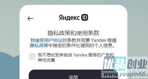 7、勾选协议点击“完毕”按钮,这样Yandex账号就注册完成了,登录即可使用。