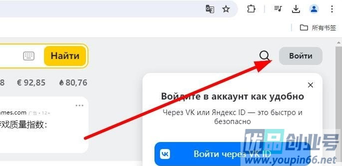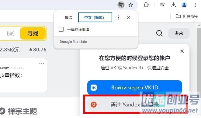 2、大家使用翻译插件把俄文翻译成中文,点击“通过Yandex ID登录”按钮。