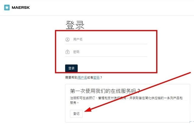 2、这里输入你的账号密码即可登录,如果没有sealandmaersk账号,点击下方的“登记”按钮。