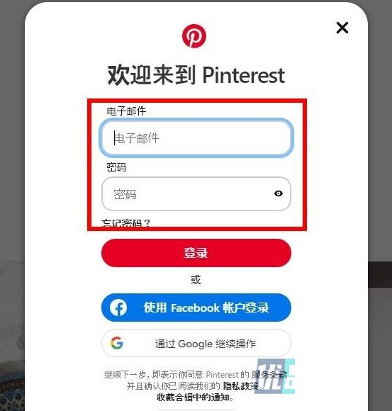 第三步:输入Pinterest邮箱和密码,点击“登录”按钮即可登录。