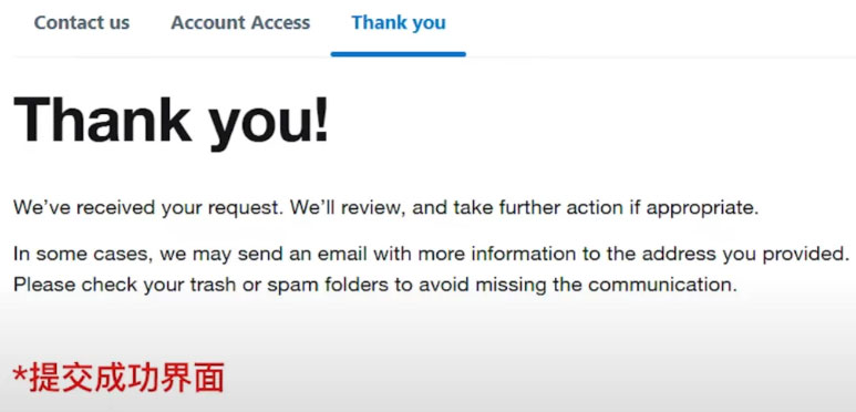 6、申诉内容填写完成以后,点击提交。就会来到如下界面,意思是感谢反馈,X平台会及时处理,我们等待官方审核处理即可。正常情况下,两个工作日内,X平台会给你答复。如果超过七个工作日,大家还可以重新再提交一次。
